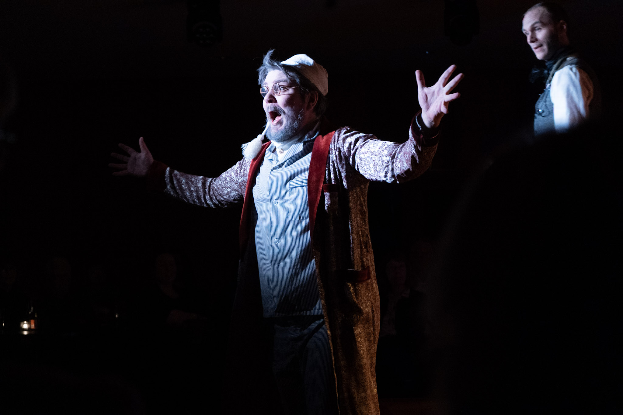 Ég elska óperur en hef alltaf tengt þær við stór svið og leikhús þar sem hátt er til lofts og vítt til veggja og þannig hef ég yfirleitt notið þeirra. Þjóðleikhúsið er minnst þeirra húsa sem ég hef séð óperu sviðsetta í. Skrautlegir búningar, stórar hljómsveitir og viðamikil leiktjöld hafa svo búið tónlistinni umgjörð við hæfi. Það kom því verulega á óvart að Þjóðleikhúskjallarinn lifnaði við og varð að höll hins forríka Don Pasquale og garðurinn í kring bæði stór og skrautlegur þótt leikmyndin væri ekki annað en upphækkaður pallur, stóll og grænn brúskur. Það er með ólíkindum hversu hugvitsamlega hópnum tókst að nýta salinn og stækka hann svo um munaði í hugum áhorfenda.